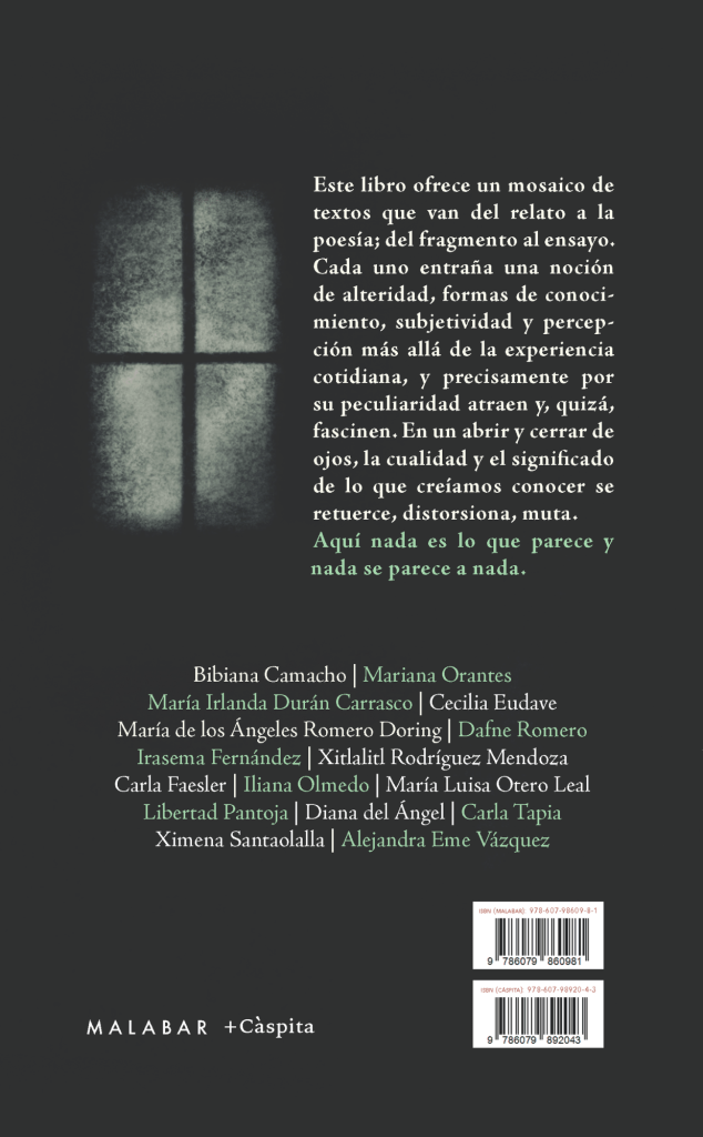 Este libro ofrece un mosaico de textos que van del relato a la poesía; del fragmento al ensayo. Cada uno entraña una noción de alteridad, formas de conocimiento, subjetividad y percepción más allá de la experiencia cotidiana, y precisamente por su peculiaridad atraen y, quizá, fascinen. En un abrir y cerrar de ojos, la cualidad y el significado de lo que creíamos conocer se retuerce, distorsiona, muta. Aquí nada es lo que parece y nada se parece a nada.